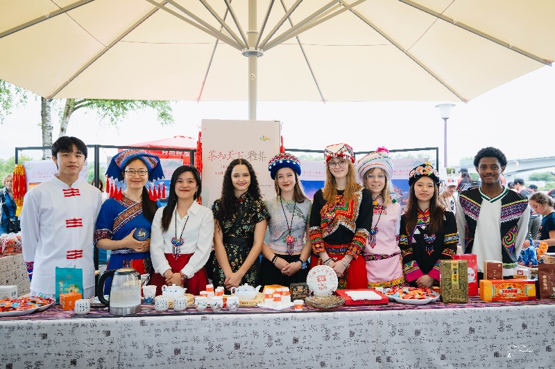 Ambassador Hua Ning and Counselor Wang Yuan appeared in the exhibition area alongside volunteers, all dressed in traditional ethnic attire from Yunnan. Together, they guided visitors through an immersive experience of “Kung Fu Tea” techniques and hospitality rituals, while inviting them to sample renowned Yunnan highland teas such as Dianhong, Pu’er, and white tea—bringing the local public closer to Chinese culture through hands-on engagement. The exhibition also featured a special tasting area for Yunnan-style tea snacks, where delicacies like flower cakes and pea flour desserts proved especially popular, offering guests a flavorful glimpse into the rich culinary heritage of the region.